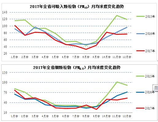 通过近三年的环境空气质量监测数据表明,我省的环境空气环境质量得到了持续改善。2017年,全省9个市(州)政府所在地按《环境空气质量标准》(GB 3095-2012)开展监测和评价,城市空气环境质量优良天数比例为83.3%,同比提高了1.3个百分点;可吸入颗粒物(PM10)年均浓度为67微克/立方米,同比下降5.6%;细颗粒物(PM2.5)年均浓度为40微克/立方米,同比下降7.0%;二氧化硫年均浓度为20微克/立方米,同比下降13.0%;二氧化氮年均浓度为28微克/立方米,同比持平;一氧化碳95百分位浓度为1.7毫克/立方米,同比上升6.3%;臭氧8小时90百分位浓度为135微克/立方米,同比下降1.5%。