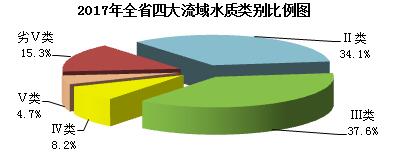 2017年,全省41条江河,85个国控监测断面水质评价结果如下:Ⅱ类水质监测断面29个,占34.1%,同比无变化;Ⅲ类水质监测断面32个,占37.6%,同比上升4.7%;Ⅳ类水质监测断面7个,占8.2%,同比下降2.4%;Ⅴ类水质监测断面4个,占4.7%,同比无变化;劣Ⅴ类水质监测断面13个,占15.3%,同比下降2.3%。