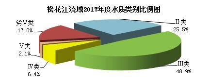 松花江流域在吉林省境内共监测了二道松花江、松花江干流等27条河流,共计47个监测断面。其中,Ⅱ类水质监测断面12个,占25.5%;Ⅲ类水质监测断面23个,占48.9%;Ⅳ类水质监测断面3个,占6.4%;Ⅴ类水质监测断面1个,占2.1%;劣Ⅴ类水质监测断面8个,占17.0%。达到本年度水质控制目标的断面有43个,占91.5%。