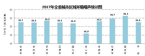 全省9个地级以上城市共对110个点位开展功能区噪声监测。城市疗养区、居住区、混合区、工业区、交通干线两侧区域和铁路干线两侧区域等功能区昼间噪声平均达标率分别为100.0%、73.9%、79.1%、95.6%、94.9%和93.1%,夜间噪声平均达标率分别为100.0%、50.6%、75.2%、76.4%、44.9%和47.2%,各类城市功能区声环境质量昼间达标率均高于夜间。