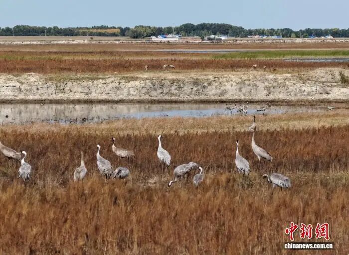 10月4日,吉林镇赉,一群灰鹤在靠近村庄的水域觅食  潘晟昱 摄
