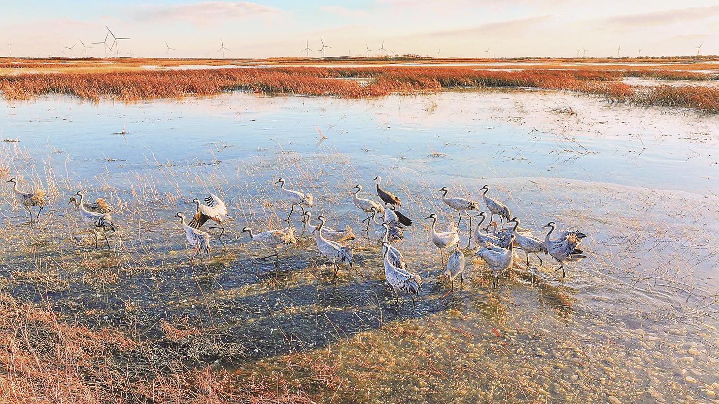 洮南市坚持“生态优先、绿色发展”理念,全面加强生态环境保护,让四海湖国家湿地公园成了天蓝水清的候鸟栖息和繁衍的乐园。图为白枕鹤正在湿地内觅食。