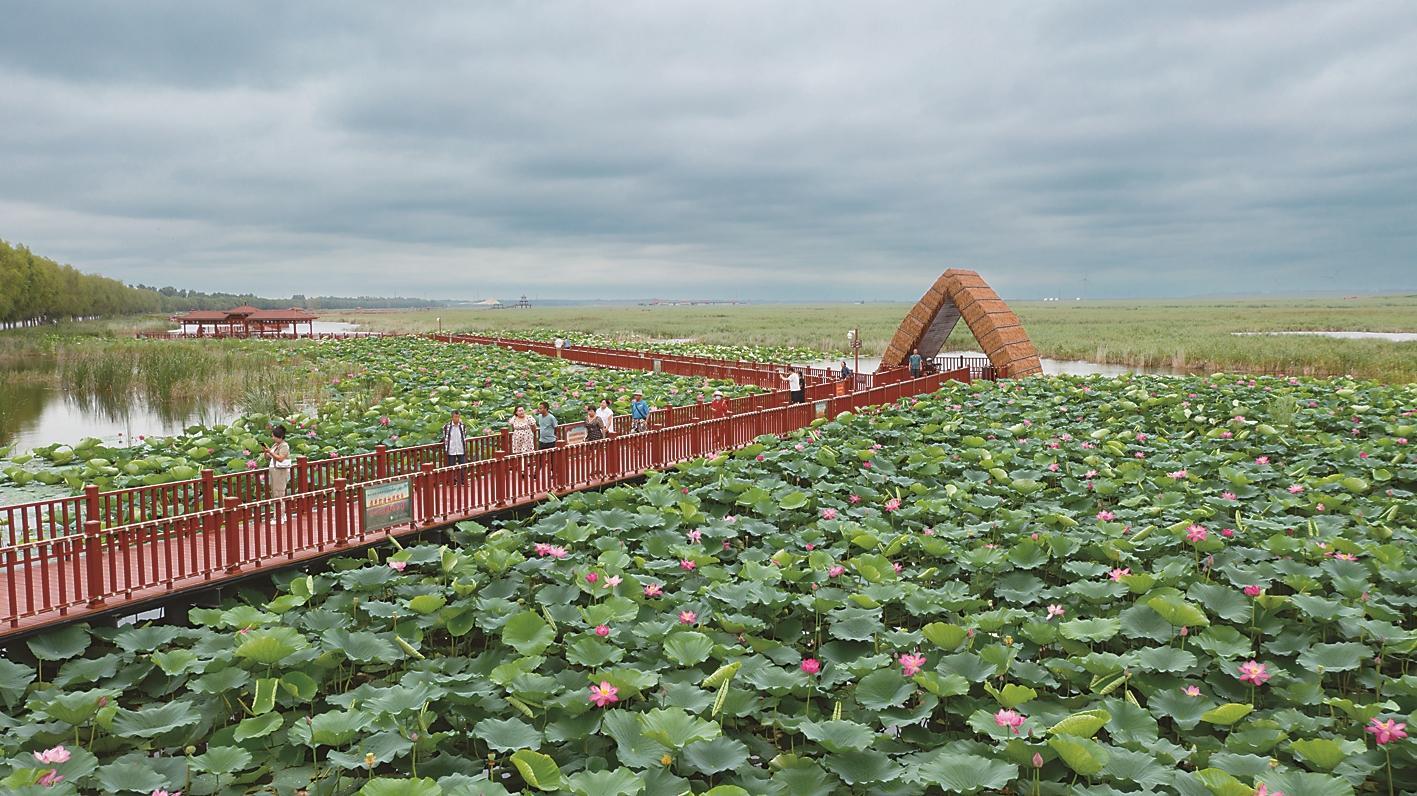 松原市不断加强生态保护与治理工作,推动查干湖生态环境的可持续发展。图为游客在查干湖景区赏荷。