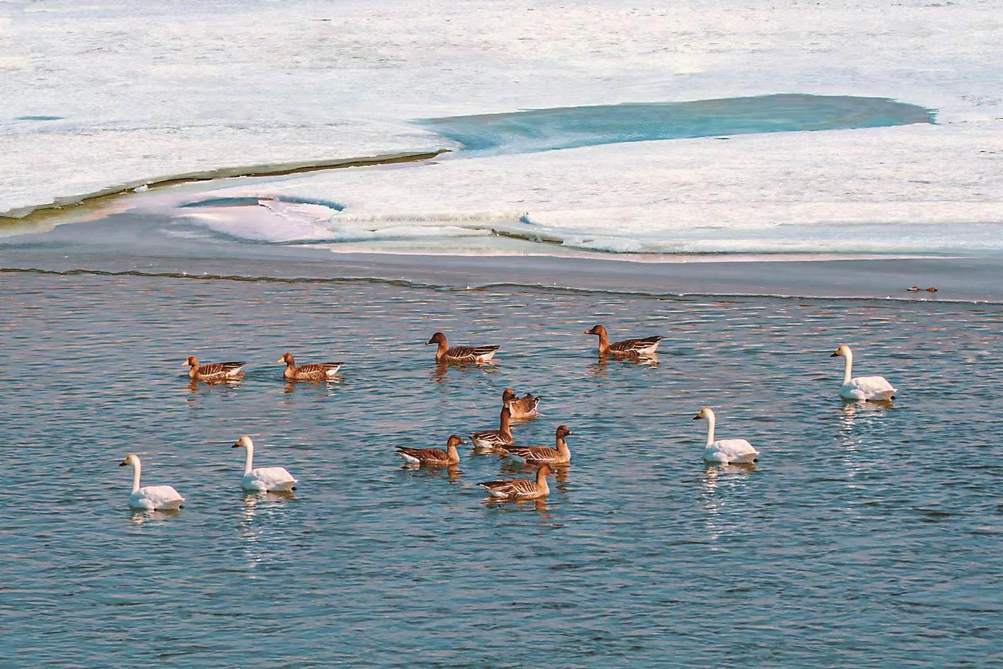 近年来,白山市浑江区多举措提升河流水环境质量,紧紧围绕全域旅游发展战略,深入推进万里绿水长廊项目建设。图为白山市浑江区张家村迎来了一群回迁的天鹅和大雁,在河面上栖息觅食。