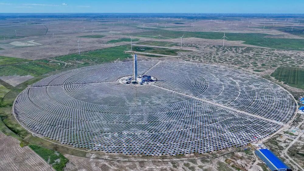 吉林省大安市乐胜乡,定日镜排列成阵,精准反射阳光至中央集热塔,将熔盐加热储存。中广核吉西基地鲁固直流10万千瓦熔盐塔式光热项目负责人赵雄说,高温熔盐可在夜间或阴天持续发电,有效平抑波动,提升绿电并网稳定性。