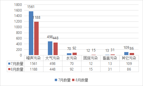 2024年8月,彩金网 部门共受理1779件生态环境问题信访投诉,同比增长26.53%,环比下降19.28%,其中已办结1684件,办结率约为94.66%。从污染类型分类情况来看,噪声污染问题1188件,占总数的63.87%(其中工业噪声108件、建设施工噪声69件、社会生活娱乐噪声1011件,分别9.09%、5.81%、85.10%);大气污染问题448件, 占总数的24.09%;水污染问题92件,占总数的4.95%;固废污染问题15件,占总数的0.81%;畜禽粪便污染问题31件,占总数的1.67%;其它污染问题86件,占总数的4.61%。
