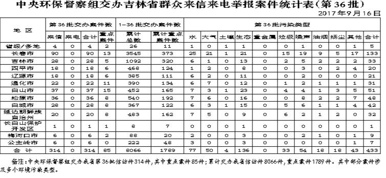 9月16日,我省接到中央环保督察组交办的第三十六批案件,共计314件。其中,重点案件85件。长春市90件(重点案件13件)、吉林市28件(重点案件5件)、四平市18件(重点案件6件)、辽源市18件(重点案件6件)、通化市22件(重点案件11件)、白山市37件(重点案件15件)、松原市36件(重点案件8件)、白城市28件(重点案件8件)、延边州20件(重点案件8件)、长白山保护开发区1件(重点案件1件)、梅河口市6件(重点案件2件)、公主岭市6件。另有交办省级办理案件4件(重点案件2件)。此批反映的各类问题中,涉及生态类问题最多,占31.4%。