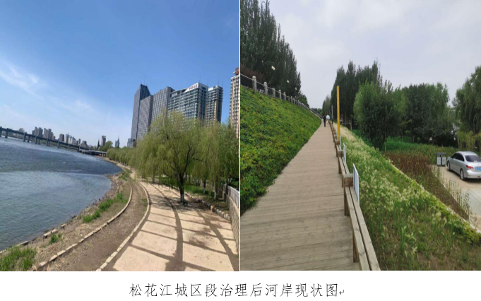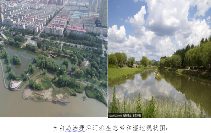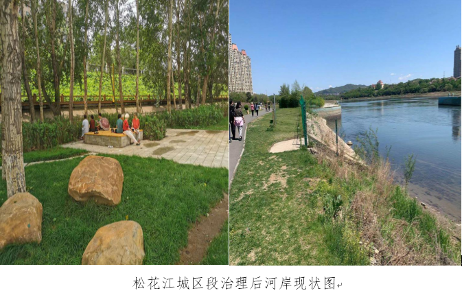 (二)生态治理效果。松花江(吉林市城区段)下游有2座污水处理厂负责吉林市城区污水处理任务,百里生态长廊长白岛段湿地水生态修复工程既对河岸滩地进行了修复,又通过恢复湿地增强了水动力。近年来,以生态廊道、生态缓冲带为主体,共实施水环境生态修复面积135万㎡,对重点河清淤,使河道河床平整、美观。
