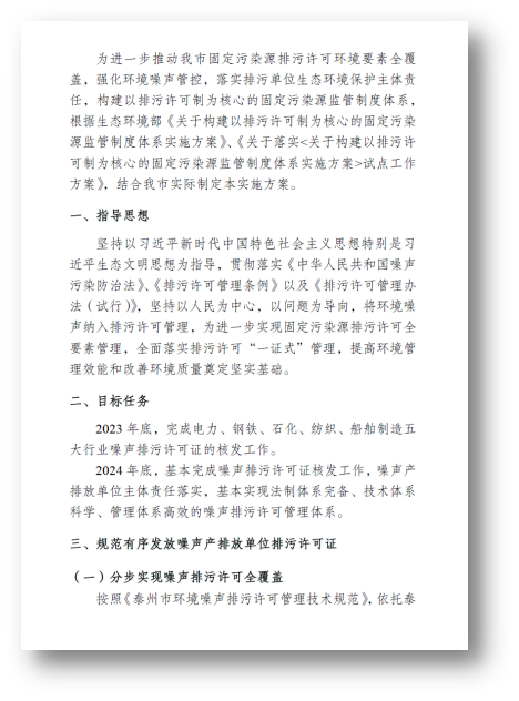 泰州市早在2021年《噪声污染防治法》修订前便开始了相关试点工作,以落实噪声产排放单位生态环境保护责任为目标导向,明确噪声排污许可管理内容,突出噪声排污许可证后监管要求,制定《泰州市环境噪声排污许可管理技术规范》,为泰州市噪声排污许可管理提出合理可行的实施路径,构建基于排污许可证的环境噪声“源头管控-过程控制”的管理模式。