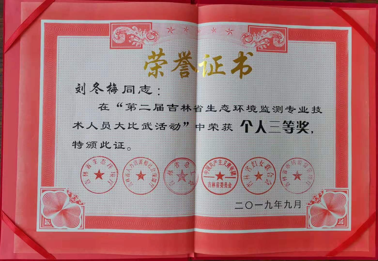 2012年刘冬梅同志代表我单位参加了“长春市环境监测专业技术人员大比武”,获得个人单项赛(高锰酸盐指数组)一等奖。在比赛前一个多月的时间里,她早上5点起床学习笔试的内容,7点多钟就到单位练习现场操作,晚上7点左右才离开单位。对于这么勤奋刻苦的同志,我单位也给予大力支持,光是标准样品就提供10余支供其练习。最终她没有辜负自己的付出和大家的期望,也实现了她的人生信条——时间和精力用在哪里,成果就出在哪里。通过这次比赛,她的专业技能也更加精进了。